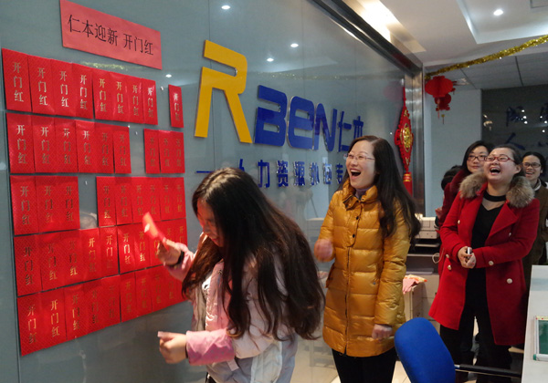 “發(fā)紅包了”,隨著仁本公司總經(jīng)理向聯(lián)合的一聲號令,貼在公司前臺墻壁上的紅包紛紛被各自的主人摘得。 2015年2月25日,是仁本人力資源公司春節(jié)后上班的第一天,也是公司傳統(tǒng)迎新“開門”發(fā)紅包的日子。與以往不同的是這個開門紅紅包中的金額有高有低,就看個人手氣。雖然外面下著小雨,刮著寒風(fēng),但公司里面到處洋溢著熱情、歡樂的氣氛;雖然紅包里的數(shù)額不一,但開心的笑容綻放在每個人的臉上。 新春伊始,蓄勢待發(fā)。經(jīng)過春節(jié)長假休息后,仁本員工們?nèi)莨鉄òl(fā),精神飽滿,以更加嶄新的面貌開始了新一年的工作,開門紅給大家?guī)淼南矏傄哺宇A(yù)示著仁本2015邁向新的飛躍。