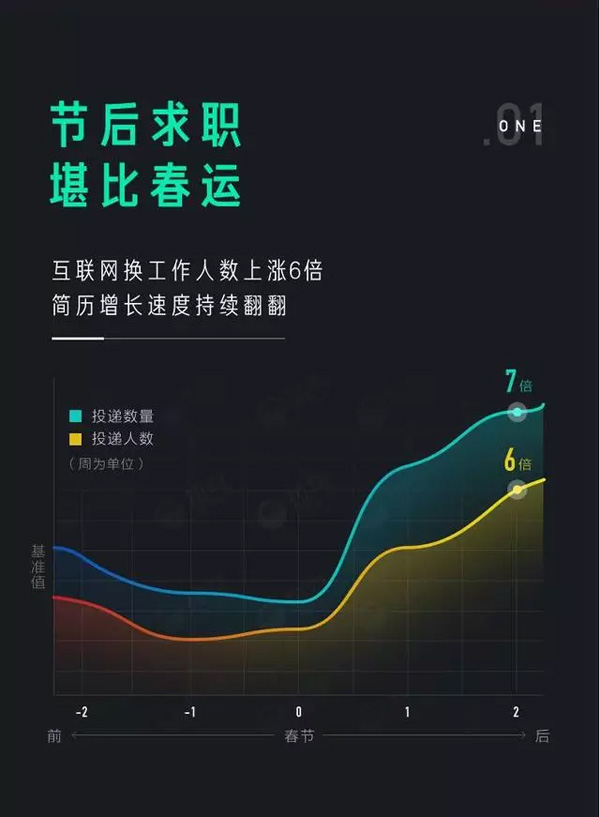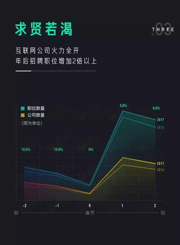 ▲ 從這張圖中可以看到,2017年節(jié)后,求職人數(shù)和簡歷投遞量漲勢(shì)明顯,年后換工作成為互聯(lián)網(wǎng)人的常態(tài)。