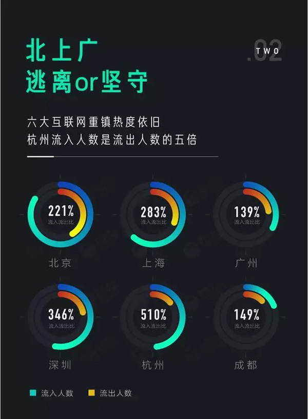 ▲ 2017年,北京、上海、廣州、深圳、成都、杭州六大互聯(lián)網(wǎng)城市的流入人數(shù)遠(yuǎn)高于流出人數(shù)。