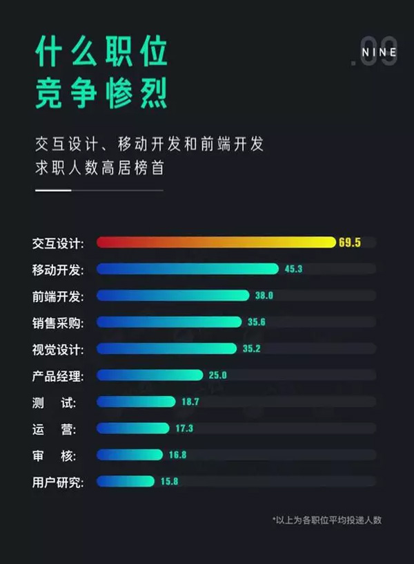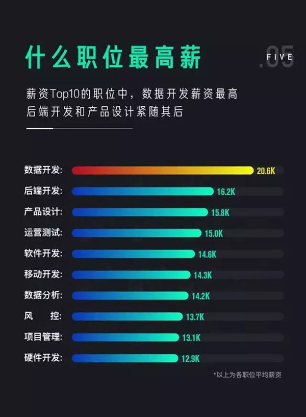 ▲ 數(shù)據(jù)開發(fā)、后端開發(fā)、產(chǎn)品設(shè)計(jì)以20.6k、16.2k、15.8k的平均月薪,成為最高薪的三大互聯(lián)網(wǎng)行業(yè)。