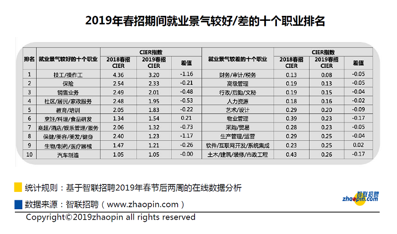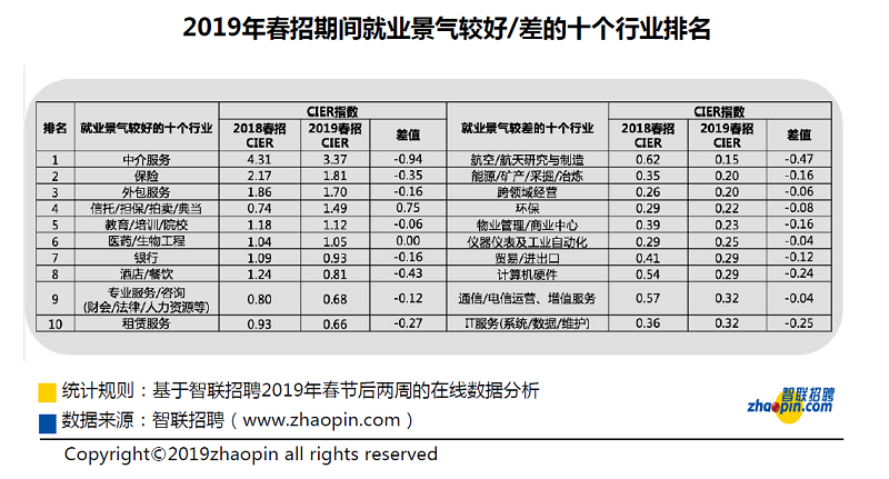 從求職端的數(shù)據(jù)來看,春招期間找工作的人數(shù)同比增加了4%,簡歷投遞次數(shù)同比增加18%,這表明單個(gè)求職者較去年投遞了更多的簡歷,且求職人數(shù)在增加,需求人數(shù)在減少的趨勢將整體影響今年春招的就業(yè)景氣度。 2019年春招期間就業(yè)景氣度低于去年 綜合供需兩端的情況,2019年春招期間的CIER指數(shù)降為1.55,較2018年的1.68略有下滑,證明今年春招期間的求職競爭程度更激烈,平均一個(gè)求職者對應(yīng)1.55個(gè)用人需求。 二、東部就業(yè)形勢墊底,中介服務(wù)業(yè)的景氣度高居榜首 東部地區(qū)春招就業(yè)景氣度落后東北,一線城市競爭依然激烈 數(shù)據(jù)顯示,2019年春招期間CIER指數(shù)仍呈現(xiàn)中部、西部、東北以及東部地區(qū)依次遞減的趨勢。同比來看,今年的CIER指數(shù)較去年均略有下滑,東部地區(qū)產(chǎn)業(yè)發(fā)展比較先進(jìn),人才競爭也比較集中,因此春招旺季這一地區(qū)的就業(yè)壓力也是*大的,景氣度墊底。 從不同城市等級看,2019年春招期間CIER指數(shù)仍呈現(xiàn)一線、新一線、二線、三線及四線城市依次遞增的趨勢。其中,僅三、四線城市的CIER指數(shù)大于1,表明在這些城市中,企業(yè)招聘需求人數(shù)要大于求職申請人數(shù);一線、新一線、二線城市的CIER指數(shù)小于1,說明企業(yè)招聘需求人數(shù)要小于求職申請人數(shù)。智聯(lián)招聘調(diào)研顯示,大多數(shù)求職者仍然希望在更大的城市就業(yè),因此大城市的競爭也往往會更激烈。 中介服務(wù)業(yè)的景氣度高居榜首,傳統(tǒng)加工制造業(yè)轉(zhuǎn)型陣痛依然明顯 數(shù)據(jù)顯示,從2019年春季求職期間排名結(jié)果來看,就業(yè)形勢最好的行業(yè)是中介服務(wù)業(yè),CIER指數(shù)高達(dá)3.37,其次是保險(xiǎn)及外包服務(wù),CIER指數(shù)分別為1.81、1.70。服務(wù)業(yè)為代表的第三產(chǎn)業(yè)因?yàn)榉?wù)業(yè)的升級和社會轉(zhuǎn)型的需要,正在持續(xù)釋放需求,吸納就業(yè)的能力十分強(qiáng)大。值得注意的是,2019年春招期間,在就業(yè)形勢較好的前十大行業(yè)中,除了信托/擔(dān)保/拍賣/典當(dāng)和醫(yī)藥/生物/工程的CIER指數(shù)是高于2018年春季求職的,其他的行業(yè)的CIER指數(shù)都低于去年。 在就業(yè)景氣較差的行業(yè)中,2019年春招期間航空/航天研究與制造業(yè)的就業(yè)景氣程度最差,CIER指數(shù)僅為0.15,其次是能源/礦產(chǎn)/采掘/冶煉業(yè),為0.20,傳統(tǒng)加工制造業(yè)的就業(yè)形勢仍然堪憂,在去年備受關(guān)注的貿(mào)易/進(jìn)出口行業(yè),在春招旺季景氣度同比下行。