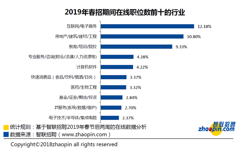 大企業(yè)薪酬誘人,小微企業(yè)工資低于平均線 數(shù)據(jù)顯示,2019年春招期間,企業(yè)規(guī)模越大,平均薪酬越高。在10,000人以上的巨無霸企業(yè)工作的員工,平均薪酬最高,為9,329元,其次是1,000-9,999人的大公司,平均薪酬為9,053元,平均薪酬最低的是小微企業(yè)的員工,為7,601元。企業(yè)規(guī)模越大,意味著具有成熟的盈利能力和完善的薪酬福利體系,員工的利益能夠得到*大程度的保障,因此平均薪酬越高。 外商薪酬最高,民營企業(yè)的平均薪酬最低 數(shù)據(jù)顯示,2019年春招期間,外企的平均薪酬最高,為9,070元,其次是上市公司,平均薪酬為8,913元,薪酬最低的是民營企業(yè),平均薪酬僅為8,025元。 四、互聯(lián)網(wǎng)、房地產(chǎn)行業(yè)人才彈藥充足,教育、醫(yī)藥工程等新興熱門行業(yè)招工難 互聯(lián)網(wǎng)/電子商務(wù)行業(yè)用工需求*大 智聯(lián)招聘數(shù)據(jù)顯示,從春季需求量*大的十大行業(yè)來看,互聯(lián)網(wǎng)/電子商務(wù)、房地產(chǎn)/建筑/建材/工程、教育/培訓(xùn)/院校行業(yè)成為前三甲。這個(gè)排名和2018年的保持一致,盡管互聯(lián)網(wǎng)行業(yè)經(jīng)過了2018年招聘需求全線下降的經(jīng)歷,仍然是穩(wěn)坐吸納就業(yè)的寶座的“頭號玩家”。值得注意的是,電子技術(shù)/半導(dǎo)體/集成電路進(jìn)入了需求前十的行業(yè),這和國家去年開始大力支持中國發(fā)展自己的芯片有關(guān),政策的傾斜會讓電子技術(shù)/半導(dǎo)體/集成電路行業(yè)的市場更加廣闊,因此企業(yè)的用人需求也隨之大增。既然有新的行業(yè)上榜,也就代表有其他的行業(yè)熱度在下降,貿(mào)易/進(jìn)出口行業(yè)在2018年在企業(yè)發(fā)布的在線職位數(shù)中排名第八,今年的排名下滑到第11名,或受到中美貿(mào)易摩擦對發(fā)展信心的影響所致。