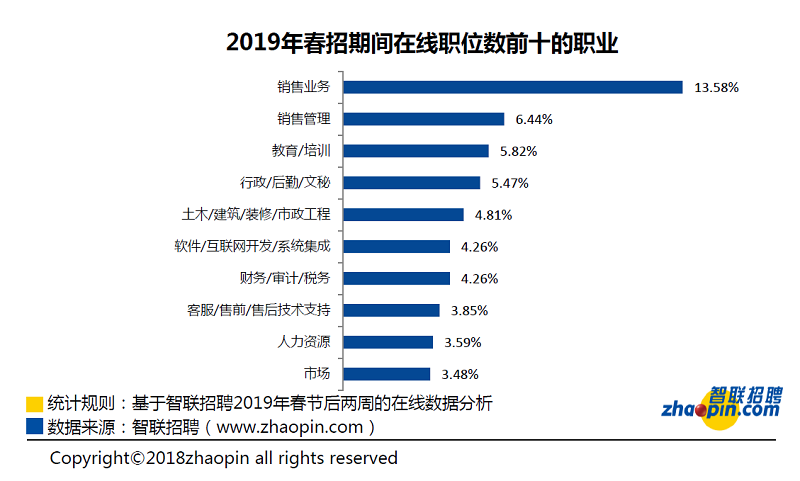教育/培訓(xùn)/院校持行業(yè)人才缺口大 智聯(lián)招聘數(shù)據(jù)顯示,從春季供給量*大的十大行業(yè)來看,排名前三的行業(yè)是房地產(chǎn)/建筑/建材/工程、互聯(lián)網(wǎng)/電子商務(wù)、計(jì)算機(jī)軟件行業(yè),其中房地產(chǎn)/建筑/建材/工程行業(yè)的求職人數(shù)遠(yuǎn)大于企業(yè)需求,而近年來持續(xù)釋放需求的教育/培訓(xùn)/院校行業(yè)卻面臨門可羅雀的尷尬處境,盡管該行業(yè)的簡歷投遞熱度不低,但是距離行業(yè)的實(shí)際需求仍有一定的差距。 開疆拓土,銷售人員需求最旺 智聯(lián)招聘數(shù)據(jù)顯示,從春季需求量*大的十大職位來看,銷售業(yè)務(wù)、銷售管理、教育/培訓(xùn)排名前三,而2018年前三大職位是銷售業(yè)務(wù)、行政/后勤/文秘、軟件/互聯(lián)網(wǎng)開發(fā)/系統(tǒng)集成。其中銷售相關(guān)崗位位居需求榜首,不難理解,在企業(yè)追求發(fā)展盈利的過程中,急需銷售角色的員工開拓市場,貢獻(xiàn)利潤。在春招期間需求次之的是行政、財(cái)務(wù)、人力資源等職能型崗位,這類崗位是公司經(jīng)營管理的基礎(chǔ),不可或缺,用人需求長期存在。
