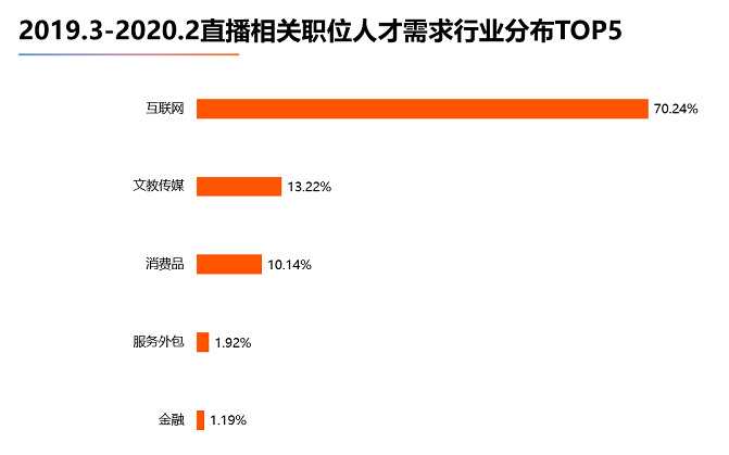 2019年3月-2020年2月,在直播類職位人才需求占比最高的前5個城市中,北京以26.52%的占比位居榜首?!扒晟潭肌睆V州與素有電商大本營之稱的杭州并列第二,人才需求占比均為15.91%。上海以14.75%的占比緊隨其后。深圳則以7.96%的占比擠入前五。 北京作為創(chuàng)新創(chuàng)業(yè)的集聚地,是國內(nèi)眾多知名直播、短視頻類公司的所在地。如抖音、快手、映客、花椒直播等都將公司總部設(shè)在北京,因此北京對直播類人才需求最旺盛。而杭州作為我國電商行業(yè)的大本營,以及有阿里的坐鎮(zhèn),對直播帶貨類人才的需求一直以來都較為旺盛,超過半數(shù)淘寶機構(gòu)都在杭州,淘寶直播的產(chǎn)業(yè)鏈上下流催生了大量相關(guān)崗位需求?!扒晟潭肌睆V州自2019年起開始化身“直播之城”,當?shù)氐姆b、旅游、美食等越來越多行業(yè)從業(yè)者在直播間里找到源源不斷的消費者。 2、行業(yè)人才需求分布:互聯(lián)網(wǎng)占據(jù)主導(dǎo)地位,直播類職位人才需求占比超70%