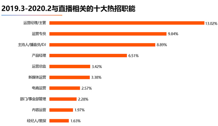 近幾年來,新興領(lǐng)域猶如雨后春筍,成為國內(nèi)新的經(jīng)濟增長點和人才集聚高地。其中,直播行業(yè),在經(jīng)歷野蠻生長后快速洗牌分化,朝著專業(yè)化、優(yōu)質(zhì)化方向發(fā)展,長期占據(jù)著人們的注意力。疫情期間,直播再次成為輿論關(guān)注的焦點。當下,直播不僅是人們休閑娛樂、獲取資訊的重要渠道,更是大量依賴線下場景的行業(yè)開展經(jīng)營活動的自救武器。淘寶數(shù)據(jù)顯示,2月份新開直播的商家數(shù)環(huán)比勁增719%,一大批線下商家通過直播實現(xiàn)了云復(fù)工。 近期,獵聘大數(shù)據(jù)研究院發(fā)布《2020年中國直播從業(yè)者大數(shù)據(jù)報告》,幫助大眾了解直播中高端從業(yè)者的就業(yè)特點,同時也展示各行業(yè)對直播類中高端人才的需求狀況,為企業(yè)和求職者雙方提供實用的決策參考依據(jù),也為相關(guān)領(lǐng)域的人才提供研究參考。 一、直播職位人才需求猛增,2019年同比增長329.36% 毫無疑問,直播已經(jīng)成為一股新的商業(yè)力量。尤其,隨著當前企業(yè)“云工作”模式的開展,云賣房、云賣車、云餐館……各行各業(yè)都在直播上找到新的可能性。直播朝著更多元化方向發(fā)展的同時,企業(yè)對直播職位人才的需求一直保持高增長勢頭。獵聘大數(shù)據(jù)顯示,2019年企業(yè)新增直播相關(guān)職位較2018年激增329.36%,可見直播行業(yè)具有極大的就業(yè)吸納空間。 而從2020年復(fù)工一個月(2020年2月3日-3月1日)來看,盡管今年春招受疫情影響較往年滯后,但企業(yè)對直播類人才的需求依然保持較高增長。與2019年復(fù)工一個月相比,2020年復(fù)工一個月直播類中高端人才的職位增長了28.08%。 二、直播類職位人才需求分析 1、城市人才需求分布:北京直播類人才需求最旺,杭州成最突出的新一線城市