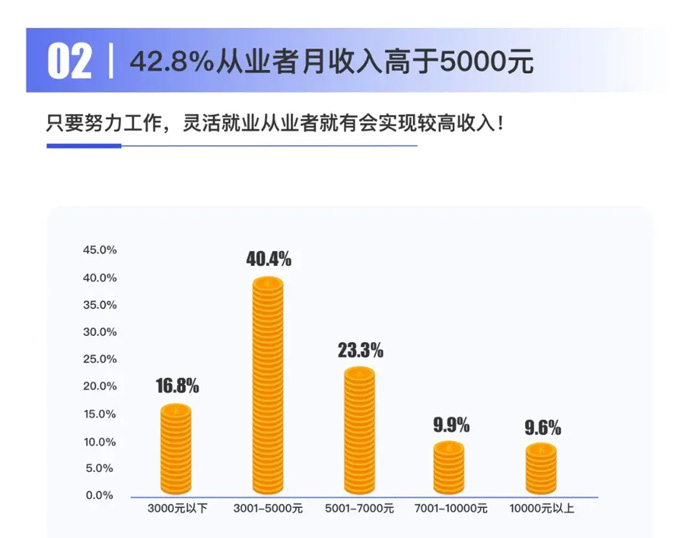 報告顯示,靈活就業(yè)催生了不少新職業(yè),包括線上運營、騎手、直播、網(wǎng)課老師、健身教練等。新職業(yè)行業(yè)主要集中在互聯(lián)網(wǎng)、電商、新零售等新經(jīng)濟類的生活服務業(yè)。 趨勢二:42.8%靈活就業(yè)從業(yè)者月收入高于5000元