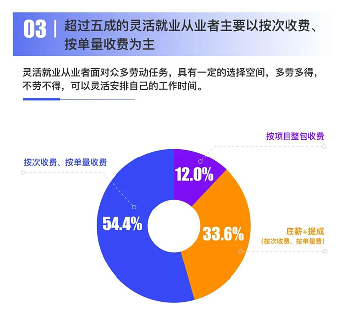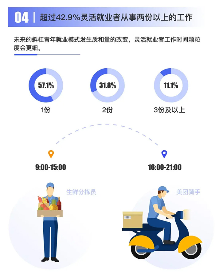 報告指出:按次收費、按單量收費是典型的基于任務的收費方式。靈活就業(yè)從業(yè)者面對眾多勞動任務,具有一定的選擇空間,多勞多得,不勞不得,可以靈活安排自己的工作時間。靈活是靈活就業(yè)的重要特性。 趨勢四:超過42.9%靈活就業(yè)者從事兩份以上的工作