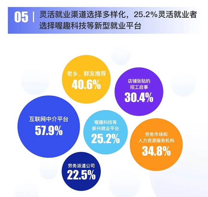 針對靈活就業(yè)的未來趨勢,喔趣科技創(chuàng)始人兼CEO儲峰表示:“過去的靈活就業(yè)指的是人崗匹配,就是把不同的人安排在不同的崗位上。真正的靈活就業(yè)實際上是任務與時間的匹配,把企業(yè)提供的崗位變成了任務,把勞動者從個體變成了時間。當勞動者的時間顆粒度更細的時候,他可以同時擁有2-3個任務,任務可以是在不同的商家、不同的店鋪工內(nèi)完成任務。” 趨勢五:靈活就業(yè)渠道選擇多樣化,25.2%靈活就業(yè)者選擇喔趣科技等新型就業(yè)平臺