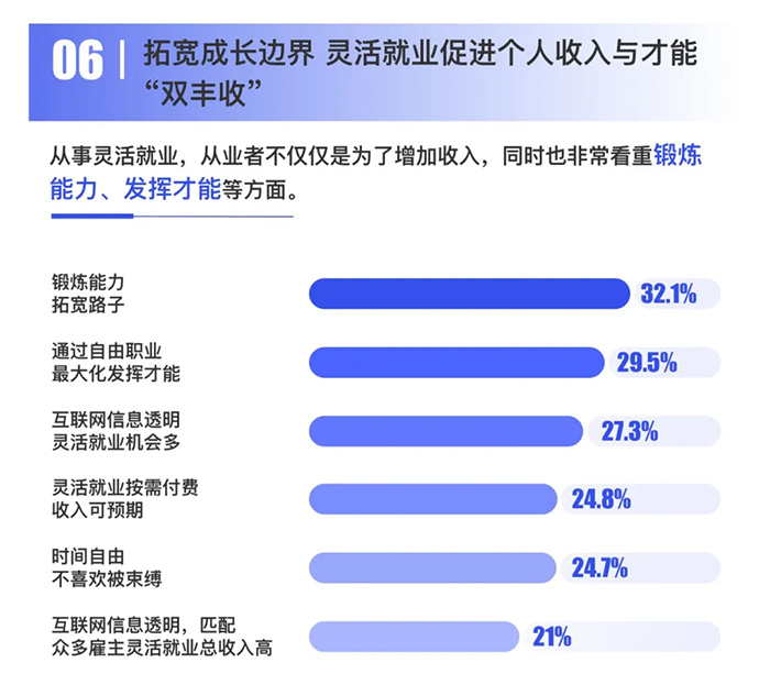 靈活就業(yè)從業(yè)者在渠道選擇方面上多樣化,傾向于等互聯(lián)網(wǎng)中介平臺 57.9%,老鄉(xiāng)、群友推薦占比40.6%,喔趣等新型靈活用工平臺占比25.2%。 趨勢六:拓寬成長邊界 靈活就業(yè)促進個人收入與才能“雙豐收”