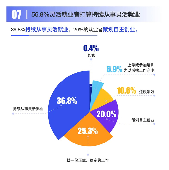 從事靈活就業(yè),從業(yè)者不僅僅是為了增加收入,同時也非常看重鍛煉能力、發(fā)揮才能等方面。32.1%的從業(yè)者是為了鍛煉能力、拓寬路子;29.5%的從業(yè)者是通過自由職業(yè)最大化發(fā)揮才能。 此外,靈活就業(yè)有利于自由職業(yè)者通過項目整包的方式向多方輸出自己的特長、技能和資源,自由職業(yè)者擁有充分的靈活性和自主權(quán),能夠?qū)崿F(xiàn)自身價值的最大化。 趨勢七:56.8%靈活就業(yè)者打算持續(xù)從事靈活就業(yè)
