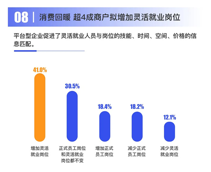 在對未來的發(fā)展規(guī)劃上,因為靈活就業(yè)具有收入方式靈活、工作時間靈活等特性,56.8%的生活服務業(yè)靈活就業(yè)從業(yè)者仍打算繼續(xù)從事靈活就業(yè)(包括做從業(yè)者和 自主創(chuàng)業(yè)兩種情況)。其中,20.0%的從業(yè)者因從事靈活就業(yè)增長了見識,提升了能力,打算走上自主創(chuàng)業(yè)之路。 趨勢八:消費回暖 超4成商戶擬增加靈活就業(yè)崗位