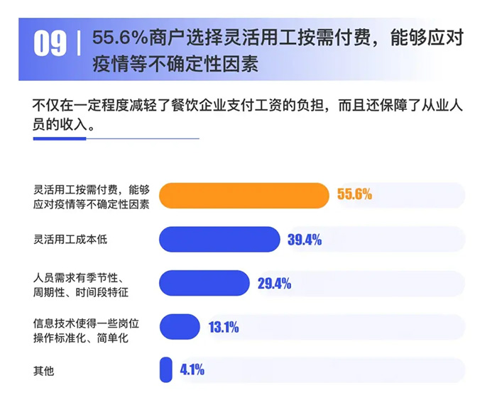 報告顯示:隨著消費復蘇,41.0%的商戶計劃在疫情后增加靈活就業(yè)崗位。互聯(lián)網(wǎng)平臺助推靈活就業(yè)發(fā)展,促進了靈活就業(yè)人員與崗位的技能、時間、空間、價格的信息匹配;此外,平臺推動了供、需雙方的數(shù)字化生態(tài)建設,創(chuàng)造了更多新就業(yè)形態(tài)和靈活就業(yè)崗位。 趨勢九:55.6%商戶選擇靈活用工按需付費,能夠應對疫情等不確定性因素