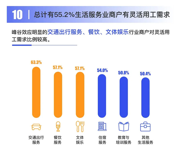 ![]() 生活服務業(yè)商戶選擇靈活用工的原因(可多選)中,55.6%的商戶選擇“靈活用工按需付費,能夠應對疫情等不確定性因素”,39.4%的商戶選擇“靈活用工成本低”, 29.4%的商戶選擇“人員需求有季節(jié)性、周期性、時間段特征”。 趨勢十:總計有55.2%生活服務業(yè)商戶有靈活用工需求