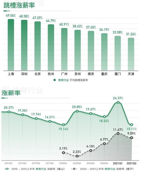 2021上半年互聯(lián)網(wǎng)行業(yè)薪酬數(shù)據(jù) 一線城市跳槽漲薪率也回落到35%上下。正式宣告疫情對(duì)于互聯(lián)網(wǎng)的影響宣告結(jié)束,一切回歸平常。 這一波大起大落,算是在極短時(shí)間經(jīng)歷了行業(yè)危機(jī)、新風(fēng)口出現(xiàn)、瘋狂搶人、行業(yè)洗牌、回歸正常。一場(chǎng)大戲,再次證明了,只有潮水褪去才知道誰(shuí)在裸泳,精彩絕倫,能夠看到一次何其有幸,但還是希望疫情這樣的危機(jī)不要再出現(xiàn)了。 2、 教育行業(yè) 相較于其他行業(yè)的“獨(dú)角戲”,教育行業(yè)簡(jiǎn)直是雙主角模式,而且兩位主角的境遇可謂一個(gè)天堂、一個(gè)地獄。這兩位主角分別是線上教育、和線下教育。