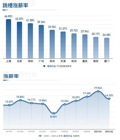 2021上半年教育行業(yè)薪酬數(shù)據(jù) 疫情對(duì)于線下教育的打擊算是一擊致命,一瞬間致死,毫無(wú)還手之力,加之國(guó)家對(duì)于課外培訓(xùn)的打擊力度, 2020年四個(gè)季度的漲薪率瞬間從2019年的平均15%上下,跌至3.19%、2.23%、4.10%、6.77%,線下教育迎來(lái)了至暗時(shí)刻。與此同時(shí),線上教育板塊,瞬間引來(lái)爆發(fā)。原來(lái)被大家嫌棄的沒(méi)有學(xué)習(xí)氛圍、效率低下、專業(yè)度不夠等等缺點(diǎn),統(tǒng)統(tǒng)變成了“真香”。所以薪智人經(jīng)常說(shuō),沒(méi)有差的模式,只有沒(méi)找對(duì)的應(yīng)用場(chǎng)景。此輪爆發(fā)過(guò)于突然,市場(chǎng)相關(guān)人才儲(chǔ)備非常不足,搶人大戰(zhàn)使得2020年線上教育漲薪率達(dá)到了15.14%、20.85%、19.67%、18.32%。 隨著疫情的影響逐漸減退,線下教育市場(chǎng)開始回暖,國(guó)家嚴(yán)控課外培訓(xùn),大家就開始轉(zhuǎn)型興趣培訓(xùn),在“被憋瘋”的家長(zhǎng)和小朋友的推動(dòng)下體育類、音樂(lè)類、美術(shù)類培訓(xùn)迎來(lái)爆發(fā)。市場(chǎng)薪酬漲薪率也在2021年第一、第二季度回到了11.67%、9.59%,雖然沒(méi)有回到2019年的平均水平,但是勢(shì)頭回來(lái)了,面包總會(huì)有的,一切都會(huì)有的。反觀線上教育,可謂“一地雞毛”,亂象叢生,經(jīng)歷了洗牌,行業(yè)也逐漸回歸理性,2021年第二季度漲薪率也回到了15.11%。 但是,說(shuō)教育行業(yè)已然完全回歸理性還為時(shí)尚早,北上深的跳槽漲薪率依然高達(dá)近50%,這還是非常不正常的數(shù)據(jù),希望線上教育能借勢(shì)蓬勃發(fā)展,而不是“作繭自縛”。 3、 醫(yī)療、醫(yī)藥行業(yè) 疫情一來(lái),醫(yī)療、醫(yī)藥行業(yè)讓大家看到:什么叫國(guó)之重器啊?(戰(zhàn)術(shù)后仰)。在此先向所有疫情期間奮戰(zhàn)在一線的醫(yī)務(wù)人員、疫苗研發(fā)的一線工作人員致以最高敬意,感覺(jué)討論漲薪率真的貶低了大家的貢獻(xiàn)。 但畢竟數(shù)據(jù)解讀,還是要看一下市場(chǎng)數(shù)據(jù),2021年第一、第二季度的漲薪率達(dá)到了19.54%、16.32%,這個(gè)數(shù)據(jù)說(shuō)明醫(yī)藥行業(yè)的熱度還沒(méi)有褪去,從跳槽漲薪率北上深都超過(guò)40%也可以證明。
