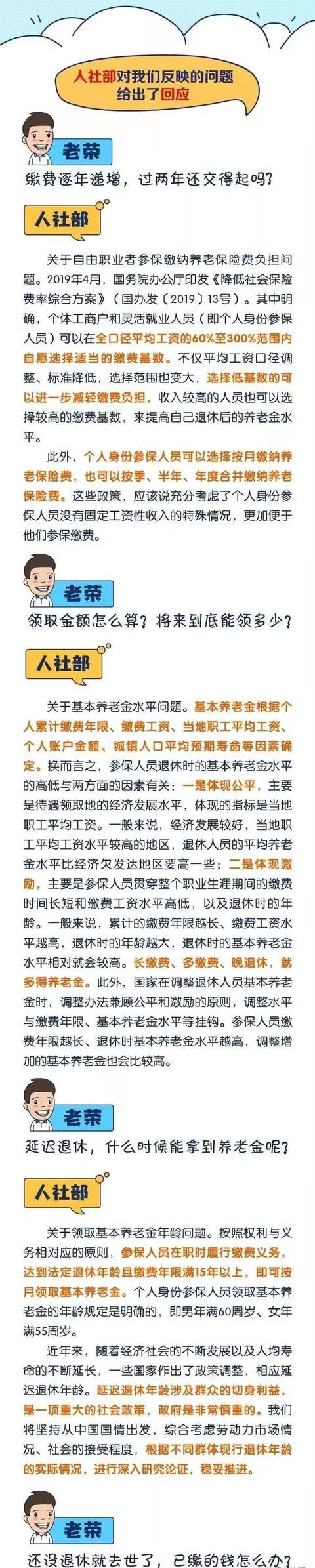 1、個(gè)人也可以參保 按照現(xiàn)行制度規(guī)定,各類企業(yè)及其職工必須參加企業(yè)職工基本養(yǎng)老保險(xiǎn),基本養(yǎng)老保險(xiǎn)費(fèi)由企業(yè)和職工共同繳納。 自由職業(yè)者、靈活就業(yè)人員等可以參保(以下簡(jiǎn)稱“個(gè)人身份參保人員”),由個(gè)人繳納基本養(yǎng)老保險(xiǎn)費(fèi),但并不是強(qiáng)制性的。 個(gè)人身份參保人員繳納養(yǎng)老保險(xiǎn)費(fèi),原來(lái)的政策規(guī)定以當(dāng)?shù)厣夏甓仍趰徛毠ぴ缕骄べY為繳費(fèi)基數(shù),繳費(fèi)比例為20%,其中8%記入個(gè)人賬戶。 2、個(gè)人可自愿選擇適當(dāng)?shù)睦U費(fèi)基數(shù) 2019年4月,國(guó)務(wù)院辦公廳印發(fā)《降低社會(huì)保險(xiǎn)費(fèi)率綜合方案》。其中明確,個(gè)體工商戶和靈活就業(yè)人員(即個(gè)人身份參保人員)可以在全口徑平均工資的60%至300%范圍內(nèi)自愿選擇適當(dāng)?shù)睦U費(fèi)基數(shù)。 不僅平均工資口徑調(diào)整、標(biāo)準(zhǔn)降低,選擇范圍也變大,選擇低基數(shù)的可以進(jìn)一步減輕繳費(fèi)負(fù)擔(dān),收入較高的人員也可以選擇較高的繳費(fèi)基數(shù),來(lái)提高自己退休后的養(yǎng)老金水平。 3、可以選擇多種方式繳納養(yǎng)老保險(xiǎn)費(fèi) 個(gè)人身份參保人員可以選擇按月繳納養(yǎng)老保險(xiǎn)費(fèi),也可以按季、半年、年度合并繳納養(yǎng)老保險(xiǎn)費(fèi)。 這些政策,應(yīng)該說(shuō)充分考慮了個(gè)人身份參保人員沒(méi)有固定工資性收入的特殊情況,更加便于他們參保繳費(fèi)。 4、經(jīng)濟(jì)發(fā)展較好地區(qū)養(yǎng)老金水平要高些 基本養(yǎng)老金根據(jù)個(gè)人累計(jì)繳費(fèi)年限、繳費(fèi)工資、當(dāng)?shù)芈毠て骄べY、個(gè)人賬戶金額、城鎮(zhèn)人口平均預(yù)期壽命等因素確定。 換而言之,參保人員退休時(shí)的基本養(yǎng)老金水平的高低與兩方面的因素有關(guān): 一是體現(xiàn)公平,主要是待遇領(lǐng)取地的經(jīng)濟(jì)發(fā)展水平,體現(xiàn)的指標(biāo)是當(dāng)?shù)芈毠て骄べY。 一般來(lái)說(shuō),經(jīng)濟(jì)發(fā)展較好,當(dāng)?shù)芈毠て骄べY水平較高的地區(qū),退休人員的平均養(yǎng)老金水平比經(jīng)濟(jì)欠發(fā)達(dá)地區(qū)要高一些; 二是體現(xiàn)激勵(lì),主要是參保人員貫穿整個(gè)職業(yè)生涯期間的繳費(fèi)時(shí)間長(zhǎng)短和繳費(fèi)工資水平高低,以及退休時(shí)的年齡。 5、長(zhǎng)繳費(fèi)、多繳費(fèi)、晚退休就多得養(yǎng)老金 一般來(lái)說(shuō),累計(jì)的繳費(fèi)年限越長(zhǎng)、繳費(fèi)工資水平越高,退休時(shí)的年齡越大,退休時(shí)的基本養(yǎng)老金水平相對(duì)就會(huì)較高。 長(zhǎng)繳費(fèi)、多繳費(fèi)、晚退休,就多得養(yǎng)老金。 此外,國(guó)家在調(diào)整退休人員基本養(yǎng)老金時(shí),調(diào)整辦法兼顧公平和激勵(lì)的原則,調(diào)整水平與繳費(fèi)年限、基本養(yǎng)老金水平等掛鉤。 參保人員繳費(fèi)年限越長(zhǎng)、退休時(shí)基本養(yǎng)老金水平越高,調(diào)整增加的基本養(yǎng)老金也會(huì)比較高。 延遲退休年齡涉及群眾的切身利益,是一項(xiàng)重大的社會(huì)政策,政府是非常慎重的。 6、退休人員無(wú)需顧慮個(gè)人賬戶儲(chǔ)存額剩余多少 應(yīng)該說(shuō),符合條件的參保人員退休后,其基本生活是有保障的。 一是國(guó)家確保基本養(yǎng)老金按時(shí)足額發(fā)放。 基本養(yǎng)老金由基礎(chǔ)養(yǎng)老金和個(gè)人賬戶養(yǎng)老金組成。其中,基礎(chǔ)養(yǎng)老金從養(yǎng)老保險(xiǎn)統(tǒng)籌基金中列支;個(gè)人賬戶養(yǎng)老金,首先從個(gè)人賬戶儲(chǔ)存額中列支。當(dāng)個(gè)人賬戶儲(chǔ)存額變?yōu)榱銜r(shí),其個(gè)人賬戶養(yǎng)老金從統(tǒng)籌基金中列支。 也就是說(shuō),退休人員無(wú)需顧慮個(gè)人賬戶儲(chǔ)存額剩余多少,國(guó)家將確保包括個(gè)人賬戶養(yǎng)老金在內(nèi)的基本養(yǎng)老金按時(shí)足額發(fā)放,這正充分體現(xiàn)了我國(guó)企業(yè)職工基本養(yǎng)老保險(xiǎn)制度的優(yōu)越性,體現(xiàn)了政府的責(zé)任和擔(dān)當(dāng)。 此外,國(guó)家政策還規(guī)定,參加養(yǎng)老保險(xiǎn)的人員死亡的,其個(gè)人賬戶余額可以繼承。 現(xiàn)在全都看明白了吧,如果你有哪些看法也歡迎在評(píng)論區(qū)留言~ |