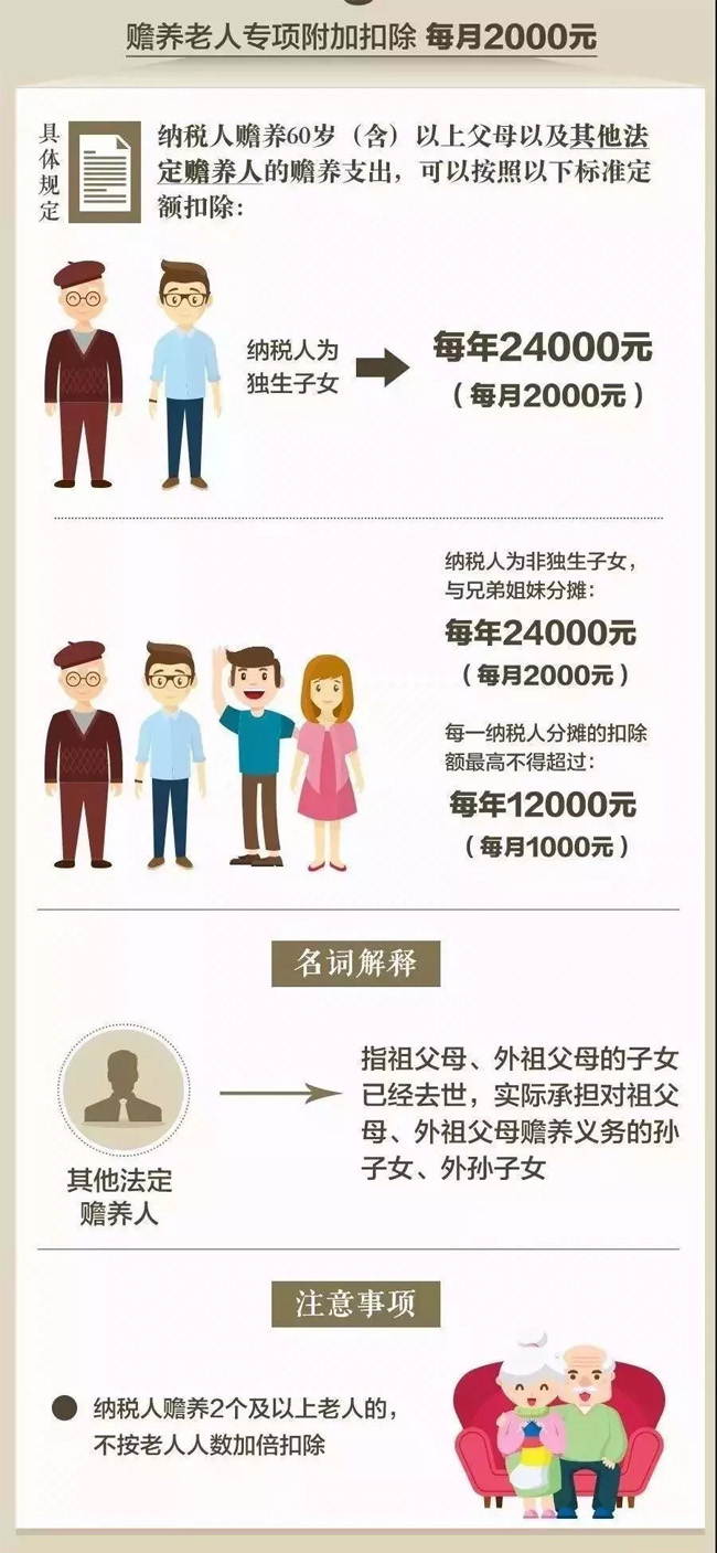 個稅贍養(yǎng)老人專項附加扣除 18個熱點問答   1.贍養(yǎng)老人專項附加扣除的扣除范圍是怎么規(guī)定的?   仁本解答:納稅人贍養(yǎng)年滿60歲父母以及子女均已去世的年滿60歲祖父母、外祖父母的贍養(yǎng)支出,可以稅前扣除。   2.贍養(yǎng)老人專項附加扣除的扣除標準是怎么規(guī)定的?   仁本解答:納稅人為獨生子女的,按照每月2000元的標準定額扣除。納稅人為非獨生子女的,應當與其兄弟姐妹分攤每月2000元的扣除額度,分攤的扣除額最高不得超過每月1000元。   3.贍養(yǎng)老人專項附加扣除的分攤方式有哪幾種?   仁本解答:贍養(yǎng)老人專項附加扣除的分攤方式包括由贍養(yǎng)人均攤或約定分攤,也可以由被贍養(yǎng)人指定分攤。采取指定分攤或者約定分攤方式的,每一納稅人分攤的扣除額最高不得超過每月1000元,并簽訂書面分攤協(xié)議。指定分攤與約定分攤不一致的,以指定分攤為準。   4.贍養(yǎng)老人專項附加扣除的扣除方式是怎樣的?   仁本解答:贍養(yǎng)老人專項附加扣除采取定額標準扣除方式。   5.贍養(yǎng)老人專項附加扣除的扣除主體是誰?   仁本解答:贍養(yǎng)老人專項附加扣除的扣除主體包括:一是負有贍養(yǎng)義務的所有子女?!痘橐龇ā芬?guī)定:婚生子女、非婚生子女、養(yǎng)子女、繼子女有贍養(yǎng)扶助父母的義務。二是祖父母、外祖父母的子女均已經(jīng)去世,負有贍養(yǎng)義務的孫子女、外孫子女。   6.納稅人父母年齡均超過60周歲,在進行贍養(yǎng)老人扣除時,是否可以按照兩倍標準扣除?   仁本解答:不能??鄢龢藴适前凑彰總€納稅人有兩位贍養(yǎng)老人測算的。只要父母其中一位達到60歲就可以享受扣除,不按照老人人數(shù)計算。   7.由于納稅人的叔叔伯伯無子女,納稅人實際承擔對叔叔伯伯的贍養(yǎng)義務,是否可以扣除贍養(yǎng)老人支出?   仁本解答:不可以。被贍養(yǎng)人是指年滿60歲的父母,以及子女均已去世的年滿60歲的祖父母、外祖父母。   8.贍養(yǎng)老人的分攤扣除,是否需要向稅務機關報送協(xié)議?   仁本解答:納稅人之間贍養(yǎng)老人支出采用分攤扣除的,如果是均攤,兄弟姐妹之間不需要再簽訂書面協(xié)議,也無需向稅務機關報送。如果采取約定分攤或者老人指定分攤的方式,需要簽訂書面協(xié)議,書面協(xié)議不需要向稅務機關或者扣繳義務人報送,自行留存?zhèn)洳椤?br/>   9.贍養(yǎng)岳父岳母或公婆的費用是否可以享受個人所得稅附加扣除?   仁本解答:不可以。被贍養(yǎng)人是指年滿60歲的父母,以及子女均已去世的年滿60歲的祖父母、外祖父母。   10.父母均要滿60歲,還是只要一位滿60歲即可?   仁本解答:父母中有一位年滿60周歲的,納稅人可以按照規(guī)定標準扣除。   11.獨生子女家庭,父母離異后再婚的,如何享受贍養(yǎng)老人專項附加扣除?   仁本解答:對于獨生子女家庭,父母離異后重新組建家庭,在新組建的兩個家庭中,只要父母中一方?jīng)]有納稅人以外的其他子女進行贍養(yǎng),則納稅人可以按照獨生子女標準享受每月2000元贍養(yǎng)老人專項附加扣除。除上述情形外,不能按照獨生子女享受扣除。在填寫專項附加扣除信息表時,納稅人需注明與被贍養(yǎng)人的關系。   12.雙胞胎是否可以按照獨生子女享受贍養(yǎng)老人扣除?   仁本解答:雙胞胎不可以按照獨生子女享受贍養(yǎng)老人扣除。雙胞胎兄弟姐妹需要共同贍養(yǎng)父母,雙胞胎中任何一方都不是父母的唯一贍養(yǎng)人,因此每個子女不能獨自2000元的扣除額度。   13.生父母有兩個子女,將其中一個過繼給養(yǎng)父母,養(yǎng)父母家沒有其他子女,被過繼的子女屬于獨生子女嗎?留在原家庭的孩子,屬于獨生子女嗎?   仁本解答:被過繼的子女,在新家庭中屬于獨生子女。留在原家庭的孩子,如沒有兄弟姐妹與其一起承擔贍養(yǎng)生父母的義務,也可以按照獨生子女標準享受扣除。   14.非獨生子女的兄弟姐妹都已去世,是否可以按獨生子女贍養(yǎng)老人扣除2000元/月?   仁本解答:一個納稅年度內(nèi),如納稅人的其他兄弟姐妹均已去世,其可在第二年按照獨生子女贍養(yǎng)老人標準2000元/月扣除。如納稅人的兄弟姐妹在2019年1月1日以前均已去世,則選擇按“獨生子女”身份享受贍養(yǎng)老人扣除標準;如納稅人已按“非獨生子女”身份填報,可修改已申報信息,1月按非獨生子女身份扣除少享受的部分,可以在下月領工資時補扣除。   15.子女均已去世的年滿60歲的祖父母、外祖父母,孫子女、外孫子女能否按照獨生子女扣除,如何判斷?   仁本解答:只要祖父母、外祖父母中的任何一方,沒有納稅人以外的其他孫子女、外孫子女共同贍養(yǎng),則納稅人可以按照獨生子女扣除。如果還有其他的孫子女、外孫子女與納稅人共同贍養(yǎng)祖父母、外祖父母,則納稅人不能按照獨生子女扣除。   16.兩個子女中的一個無贍養(yǎng)父母的能力,是否可以由余下那名子女享受2000元扣除標準?   仁本解答:不可以。按照《暫行辦法》規(guī)定,納稅人為非獨生子女的,在兄弟姐妹之間分攤2000元/月的扣除額度,每人分攤的額度不能超過每月1000元,不能由其中一人單獨享受全部扣除。   17.非獨生子女,父母指定或兄弟協(xié)商,是否可以最高某一個子女可以扣2000元?   仁本解答:根據(jù)《個人所得稅專項附加扣除暫行辦法》規(guī)