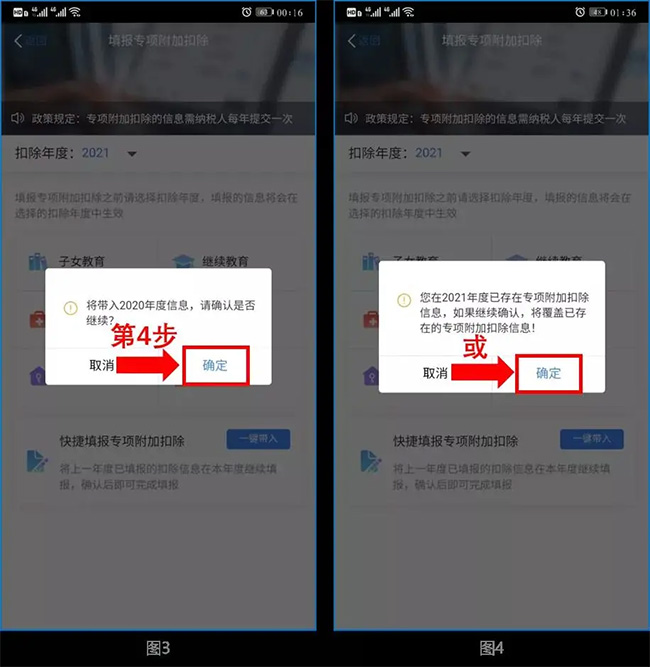 ② 依據(jù)提示“將帶入2020年度信息,請確認(rèn)是否繼續(xù)?”或者“您在2021年度已存在專項附加扣除信息,如果繼續(xù)確認(rèn),將覆蓋已存在的專項附加扣除信息!”,確認(rèn)后點擊“確定”;如下圖3、圖4: