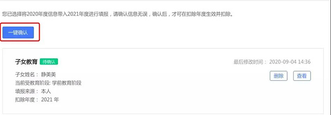?、?打開“待確認(rèn)”狀態(tài)的專項附加扣除,核對信息;如有修改,可以點擊“修改”,信息確認(rèn)后點擊“一鍵確認(rèn)”。如下圖5、圖6: