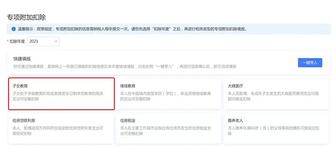 點擊“刪除”后,一鍵確認(rèn)即可。 情形(四) ?2021年需要新增專項附加扣除項目。 比如2021年新增子女教育扣除,需要申報填寫。 先按情形(1)步驟確認(rèn)之前申報的其他不需修改的專項附加扣除信息后,選擇扣除年度,點擊相應(yīng)的扣除項目進(jìn)行填報。