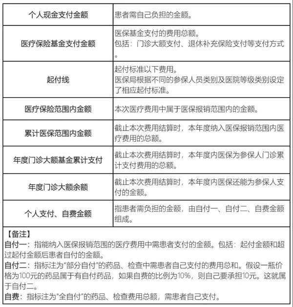 01 教你讀懂醫(yī)保結(jié)算單 一般來(lái)說(shuō)不同地區(qū)經(jīng)濟(jì)發(fā)展情況有所不同,因此各地醫(yī)保報(bào)銷的具體細(xì)節(jié)不盡相同。但是醫(yī)保報(bào)銷單上的一些專業(yè)詞語(yǔ)是相同的。 比如:起付標(biāo)準(zhǔn)、自費(fèi)藥品、基本醫(yī)療之外費(fèi)用等。今天就幫大家解析一下,結(jié)算單上各個(gè)費(fèi)用名稱,來(lái)幫助大家迅速讀懂醫(yī)保報(bào)銷: