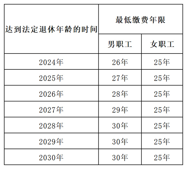 從2030年1月1日起,男職工為30年,女職工為25年。 2018年1月1日后(含1月1日)在本市首次參加職工醫(yī)保(2018年1月1日前從未參加過(guò)本市職工醫(yī)保)的參保人,最低累計(jì)繳費(fèi)年限為: