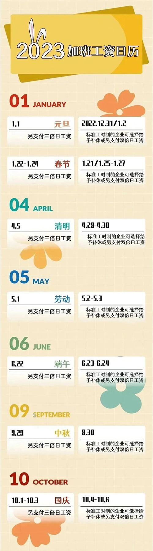按照以上規(guī)定,具體到五一假期,我們要按以下方式計(jì)算標(biāo)準(zhǔn)工時(shí)制的加班工資。 今年5月1日(勞動(dòng)節(jié))是法定節(jié)假日,法律不允許調(diào)休,只要安排加班應(yīng)支付不低于本人日工資的300%的工資報(bào)酬。 三倍工資計(jì)算公式: 5月1日(勞動(dòng)節(jié)),即:月工資基數(shù)÷21.75÷8×加班小時(shí)數(shù)×300%。 二倍工資計(jì)算公式 4月29日、30日、5月2日、3日,即:月工資基數(shù)÷21.75÷8×加班小時(shí)數(shù)×200%。 員工拒絕加班用人單位能否解除勞動(dòng)合同? 在現(xiàn)實(shí)生活中,很多公司會(huì)有一些不合理的加班需求,那員工可以拒絕嗎?如果員工拒絕加班安排,公司可以以不服從加班安排為由解除勞動(dòng)合同嗎? 一、員工可以拒絕加班安排嗎? 這個(gè)要看具體情況。 一般情況下,員工可以拒絕加班,依據(jù)是《勞動(dòng)法》第41條的規(guī)定: 用人單位由于生產(chǎn)經(jīng)營(yíng)需要,經(jīng)與工會(huì)和勞動(dòng)者協(xié)商后可以延長(zhǎng)工作時(shí)間。 從該條規(guī)定來(lái)看,加班需要協(xié)商一致,若用人單位單方安排,勞動(dòng)者同意是可以的;勞動(dòng)者不同意加班的,也是可以的。 但特殊情況下,員工應(yīng)服從加班,依據(jù)是《勞動(dòng)法》第42條的規(guī)定: 《勞動(dòng)法》第四十二條 有下列情形之一的,延長(zhǎng)工作時(shí)間不受本法第四十一條規(guī)定的限制: 發(fā)生自然災(zāi)害、事故或者因其他原因,威脅勞動(dòng)者生命健康和財(cái)產(chǎn)安全,需要緊急處理的; 生產(chǎn)設(shè)備、交通運(yùn)輸線路、公共設(shè)施發(fā)生故障,影響生產(chǎn)和公眾利益,必須及時(shí)搶修的; 法律、行政法規(guī)規(guī)定的其他情形。 需要指出的是,用人單位生產(chǎn)經(jīng)營(yíng)需要,一般不屬于上述特殊情況。 二、勞動(dòng)者拒絕加班,公司可以以不服從加班安排為由解除勞動(dòng)合同嗎? 根據(jù)《中華人民共和國(guó)勞動(dòng)法》第四十一條規(guī)定: 用人單位由于生產(chǎn)經(jīng)營(yíng)需要,經(jīng)與工會(huì)和勞動(dòng)者協(xié)商后可以延長(zhǎng)工作時(shí)間,一般每日不得超過(guò)一小時(shí);因特殊原因需要延長(zhǎng)工作時(shí)間的,在保障勞動(dòng)者身體健康的條件下延長(zhǎng)工作時(shí)間每日不得超過(guò)三小時(shí),但是每月不得超過(guò)三十六小時(shí)。 第四十三條規(guī)定: 用人單位不得違反本法規(guī)定延長(zhǎng)勞動(dòng)者的工作時(shí)間。 也就是說(shuō),用人單位安排員工加班,也是有時(shí)間限制的,每天不能超過(guò)1小時(shí),每個(gè)月不能超過(guò)36小時(shí)。 根據(jù)《中華人民共和國(guó)勞動(dòng)合同法》第二十六條規(guī)定: 下列勞動(dòng)合同無(wú)效或者部分無(wú)效: ……(三)違反法律、行政法規(guī)強(qiáng)制性規(guī)定的。 為確保勞動(dòng)者休息權(quán)的實(shí)現(xiàn),我國(guó)法律對(duì)延長(zhǎng)工作時(shí)間的上限予以明確規(guī)定。 用人單位制定違反法律規(guī)定的加班制度,在勞動(dòng)合同中與勞動(dòng)者約定違反法律規(guī)定的加班條款,均應(yīng)認(rèn)定為無(wú)效。 根據(jù)《中華人民共和國(guó)勞動(dòng)法》第四條規(guī)定: 用人單位應(yīng)當(dāng)依法建立和完善規(guī)章制度,保障勞動(dòng)者享有勞動(dòng)權(quán)利和履行勞動(dòng)義務(wù)。 法律在支持用人單位依法行使管理職權(quán)的同時(shí),也明確其必須履行保障勞動(dòng)者權(quán)利的義務(wù)。 用人單位的規(guī)章制度以及相應(yīng)工作安排必須符合法律、行政法規(guī)的規(guī)定,否則既要承擔(dān)違法后果,也不利于構(gòu)建和諧穩(wěn)定的勞動(dòng)關(guān)系、促進(jìn)自身健康發(fā)展。 為了方便大家理解,我們來(lái)看個(gè)詳細(xì)案例: 王某于2019年5月1日入職某勞務(wù)派遣公司處,雙方簽訂書面勞動(dòng)合同,合同期限為2019年5月1日至2022年4月30日,派遣公司派遣王某至某辦事處從事專職網(wǎng)格員工作,王某月工資為2800元。 2021年7月27日勞務(wù)派遣公司以“未認(rèn)真落實(shí)街道工作安排且7月17日、18日兩天無(wú)故缺勤曠工,嚴(yán)重違反工作紀(jì)律及規(guī)章制度,性質(zhì)惡劣”與王某解除勞動(dòng)合同。 辦事處陳述2021年7月17日、18日因?yàn)槿珖?guó)部分地市疫情出現(xiàn)緊急狀況,按照省市防疫工作通知申請(qǐng)人加班,但未提交省市防疫部門的有關(guān)通知。 仲裁委員會(huì)認(rèn)為,加班應(yīng)有其必要性和合理性,辦事處在緊急情況下,如突發(fā)事件,可以要求申請(qǐng)人加班,但是在日常情況下,申請(qǐng)人享有休息的權(quán)利,有權(quán)拒絕不正當(dāng)理由加班,因此認(rèn)定申請(qǐng)人7月17日、18日申請(qǐng)人不屬于曠工,勞務(wù)派遣公司違法解除勞動(dòng)合同,應(yīng)支付違法解除勞動(dòng)合同賠償金。(部分引用人力資源社會(huì)保障部和最高人民法院聯(lián)合向社會(huì)公布勞動(dòng)人事爭(zhēng)議典型案例(第二批)) 附2023年加班工資日歷