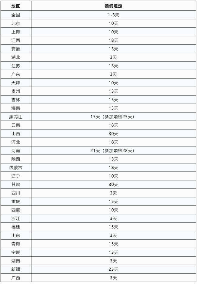 2、國(guó)家層面上關(guān)于婚假的規(guī)定 根據(jù)勞動(dòng)法第四章第五十一條規(guī)定: 勞動(dòng)者在法定休假日和婚喪假期間以及依法參加社會(huì)活動(dòng)期間,用人單位應(yīng)當(dāng)依法支付工資。 另外,根據(jù)《計(jì)劃生育條例》的規(guī)定: 1.按法定結(jié)婚年齡(女20周歲,男22周歲)結(jié)婚的可享受3天婚假。 2.符合晚婚年齡(女23周歲,男25周歲)的將不再享受晚婚假獎(jiǎng)勵(lì)也只有3天法定婚假。 3.結(jié)婚時(shí)男女雙方不在同一地方工作的,可視路程遠(yuǎn)近給予路程假。 4.在探親假期間結(jié)婚的不另給假期。 5.婚假包括公休假和法定假。 6.再婚者與初婚者一樣可享受法定婚假。 關(guān)于婚假工資計(jì)算方式 在婚假的問題上,雖然國(guó)家對(duì)職工的休息、休假有規(guī)定,但并未明確規(guī)定工資計(jì)發(fā)的標(biāo)準(zhǔn)。 《關(guān)于國(guó)營(yíng)企業(yè)職工請(qǐng)婚喪假和路程假問題的通知》規(guī)定:職工本人結(jié)婚可以根據(jù)具體情況,由本單位行政領(lǐng)導(dǎo)批準(zhǔn),酌情給予一至三天的婚喪假。 假期在三個(gè)工作日以內(nèi)的,工資照發(fā)。在批準(zhǔn)的婚喪假和路程假期間職工的工資照發(fā)。途中的車船費(fèi)等,全部由職工自理。 因此在婚假的工資發(fā)放標(biāo)準(zhǔn)上,目前還沒有適用于全國(guó)的統(tǒng)一規(guī)定。 婚假是否有有效期? 1、我國(guó)法律并沒有對(duì)婚假的有效期做出明確的規(guī)定。一般來說,不同的公司會(huì)有不同的規(guī)章制度來約定婚假的有效期。 2、對(duì)于公司來說,一般規(guī)定員工一年或是半年之內(nèi)必須休完婚假,否則視為自動(dòng)放棄該福利。 3、婚假必須一次性休完,不可單獨(dú)分開使用。 3、2023最新版全國(guó)婚假一覽表