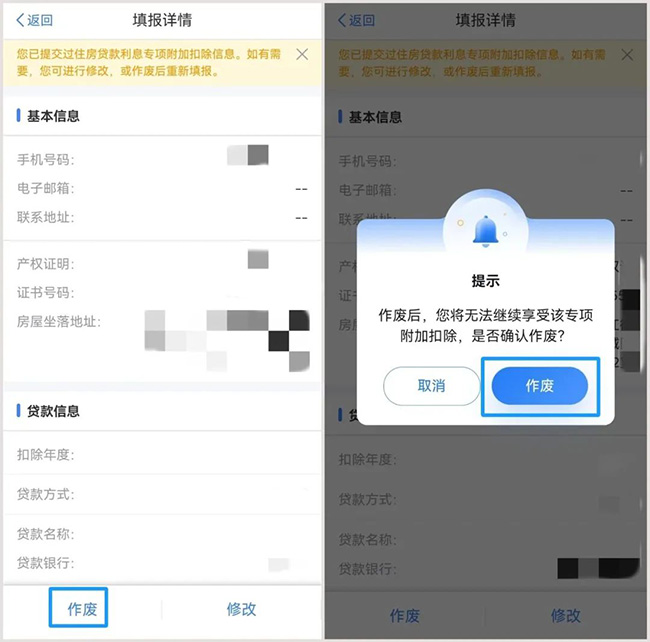 情形三:2024年需作廢專項(xiàng)附加扣除項(xiàng)目 1.點(diǎn)擊【專項(xiàng)附加扣除填報(bào)】,進(jìn)入填報(bào)頁面?!咎顖?bào)記錄】選擇【查詢年度2024年】。 2.點(diǎn)擊進(jìn)入想要作廢的專項(xiàng)附加扣除項(xiàng)目。點(diǎn)擊左下角【作廢】,確認(rèn)作廢后,即可作廢成功。